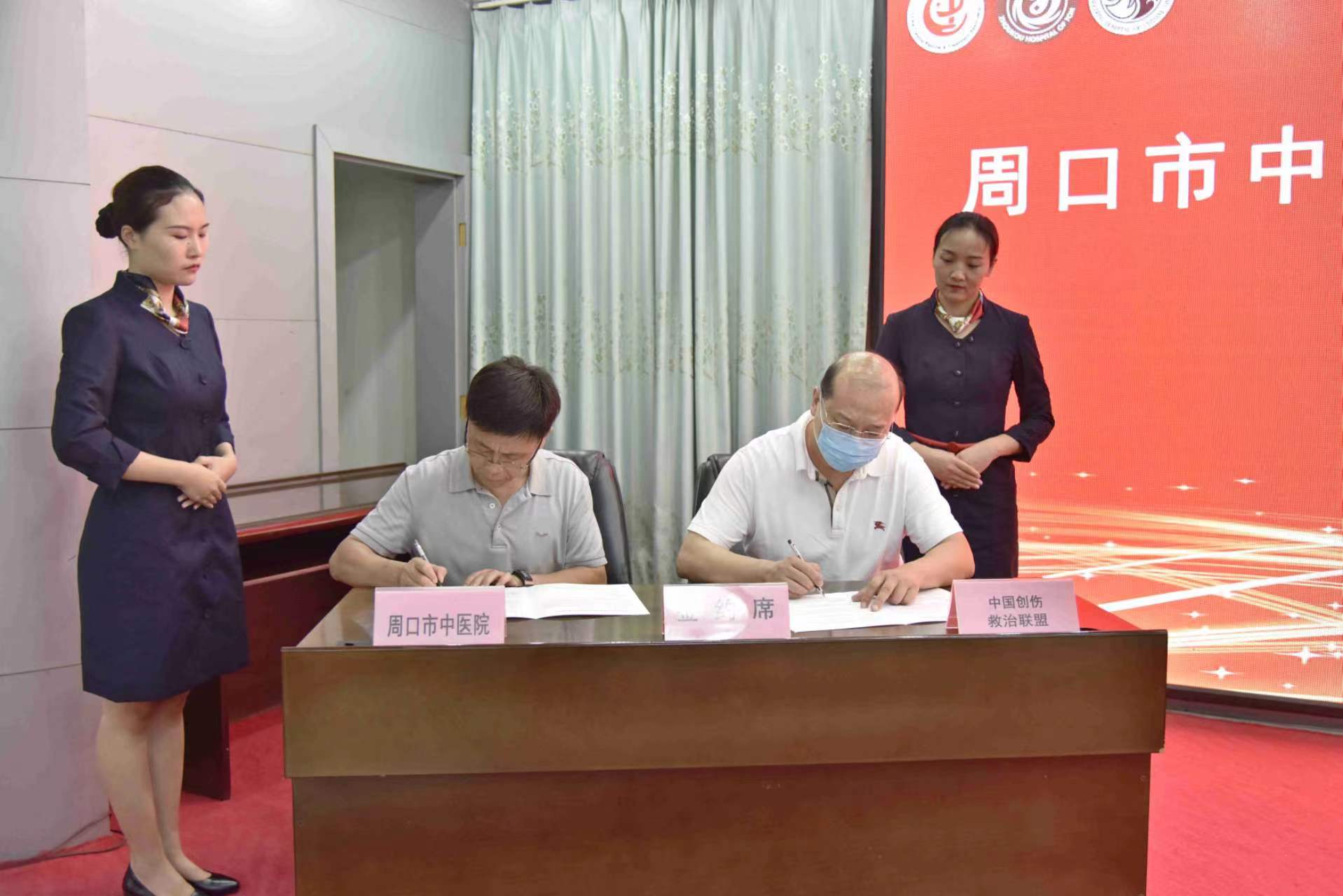 在與會人員的共同見證下,中國創傷救治聯盟代表劉寒松和周口市中醫院副院長史衛東共同簽署了《中國創傷救治聯盟創傷救治中心建設單位協議書》,授予我院“中國創傷救治聯盟創傷救治中心建設單位”的牌匾。由此,周口市中醫院正式成為由中國創傷救治聯盟正式授牌的創傷救治中心建設單位。