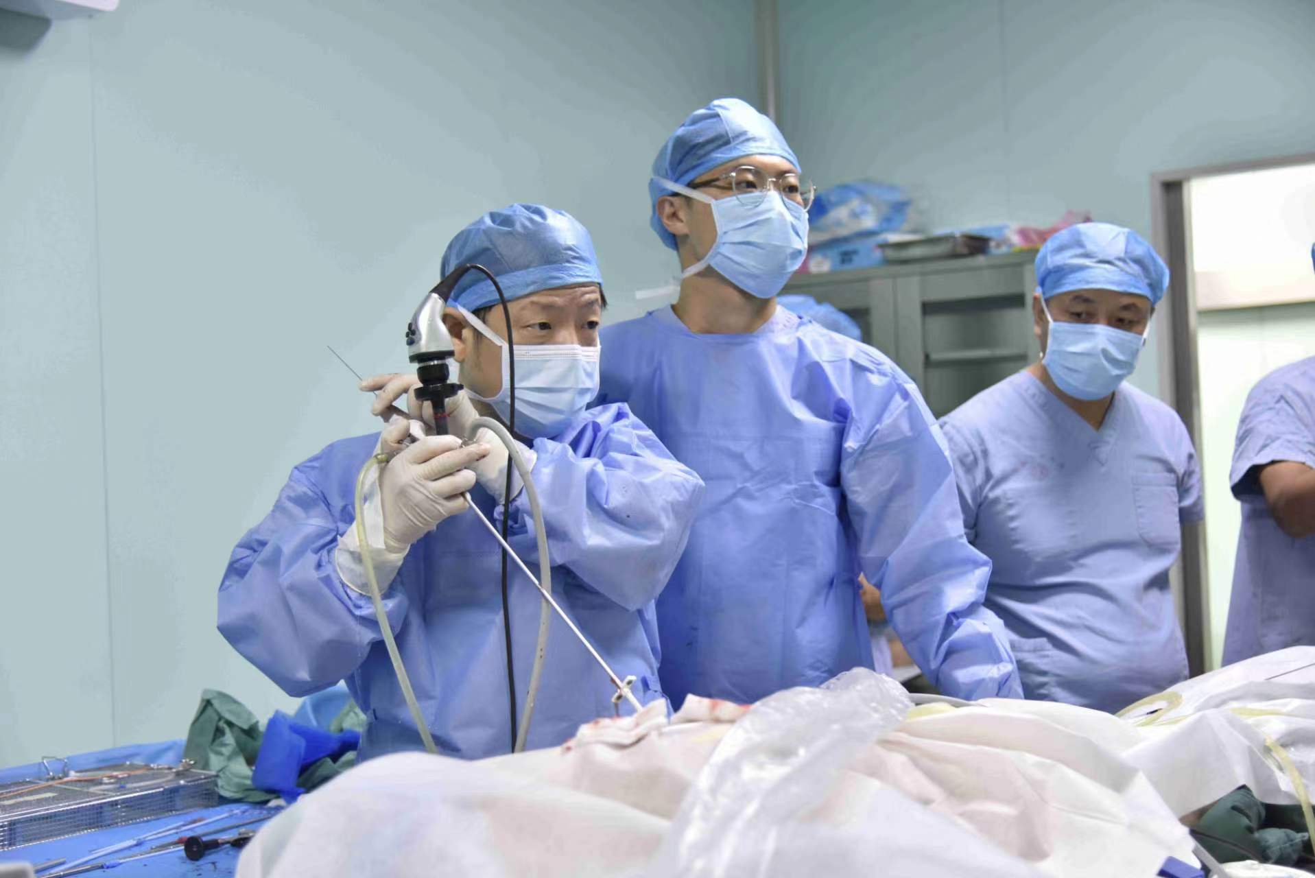 手術(shù)室內(nèi),河南省中西醫(yī)結(jié)合學(xué)會(huì)泌尿外科分會(huì)主委、河南中醫(yī)藥大學(xué)第一附屬醫(yī)院主任醫(yī)師、泌尿外科二病區(qū)主任、碩士生導(dǎo)師何文強(qiáng)教授,河南中醫(yī)藥大學(xué)第一附屬醫(yī)院副主任醫(yī)師劉聰、河南中醫(yī)藥大學(xué)第一附屬醫(yī)院醫(yī)學(xué)碩士屈穎偉進(jìn)行手術(shù)示教,對(duì)腎結(jié)石、腎囊腫患者進(jìn)行鈥激光軟鏡手術(shù)、腔鏡手術(shù)等,讓老百姓在家門口就能享受到省內(nèi)知名專家的診療。