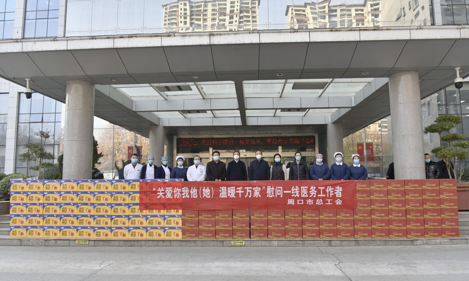 1月10日,周口市總工會黨組成員、副主席郭建軍,市總工會、市直工會主任王劍一行代表市總工會為我院奮戰在一線的醫務人員送來了面包、方便面等物資,同時把工會組織的關心慰問送到一線干部職工身邊。