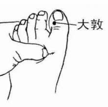 “大敦”穴在足趾,大趾末節外側,趾甲根角旁開0.1寸(指寸)。坐位,足大趾趾甲外側緣與下緣各作一垂線交點處。