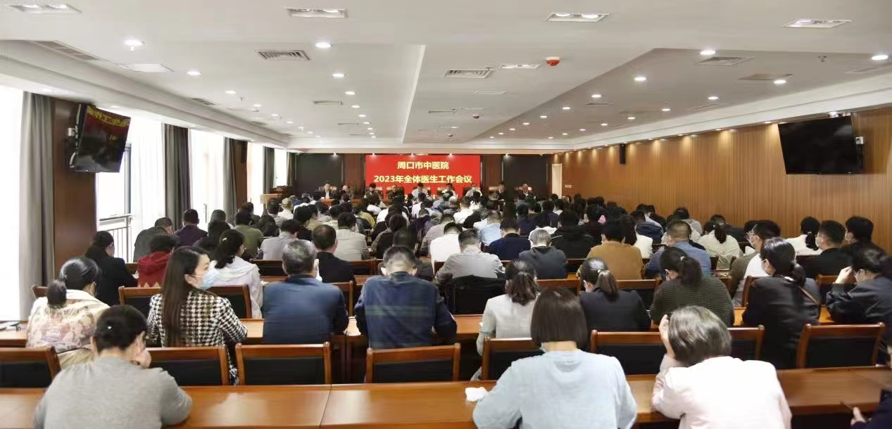 2023年4月14日,周口市中醫院召開全體醫生工作會議。參加此次會議的有周口市中醫院黨委書記史衛東、副院長魯恒心、副院長孫俊、工會主席張紅梅、醫務科科長劉勤建、科教科科長胡維來、醫保科科長郝海群、全質辦科長趙傳印。此外還有來自全院各醫療科室的主任、醫生200余人參加了此次會議。會議由黨委書記史衛東主持。
