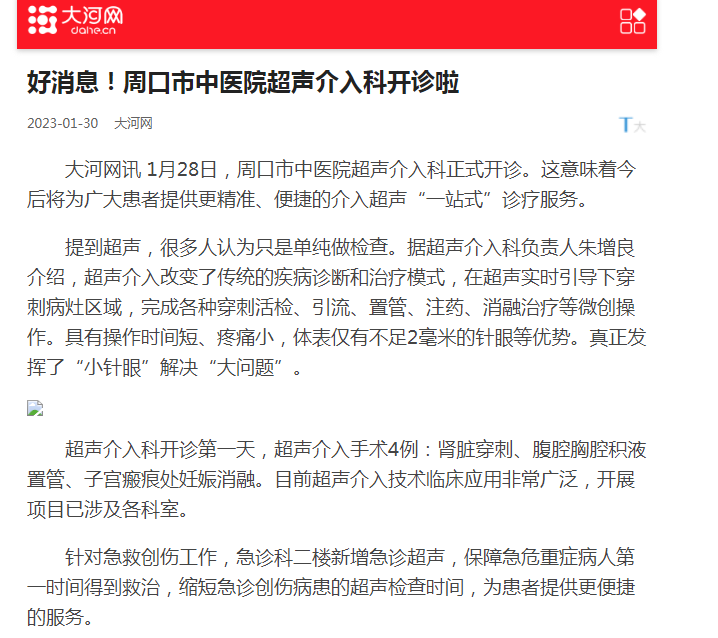 大河網訊 1月28日,周口市中醫院超聲介入科正式開診。這意味著今后將為廣大患者提供更精準、便捷的介入超聲“一站式”診療服務。