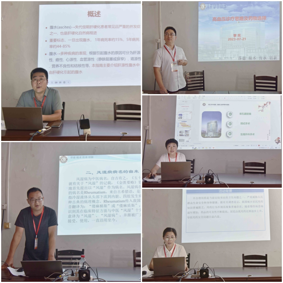 7月21日下午,周口市中醫(yī)院選派的專家們?yōu)槲魅A縣葉埠口鄉(xiāng)衛(wèi)生院的醫(yī)護(hù)人員及下轄鄉(xiāng)村醫(yī)生們分別以《肝硬化腹水及相關(guān)并發(fā)癥的診療指南》、《淺談風(fēng)濕病》、《高血壓診療思路及藥物選擇》、《婦科微創(chuàng)手術(shù)病歷分享》、《糖尿病的合理用藥》為題進(jìn)行了學(xué)術(shù)專題講座。專家們的精彩講解,不時(shí)獲得陣陣掌聲。