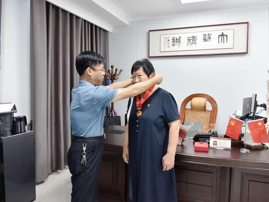8月3日上午,周口市中醫(yī)院黨委書記史衛(wèi)東同志為我院退休老黨員牛俊榮同志頒發(fā)“光榮在黨50年”紀(jì)念章。