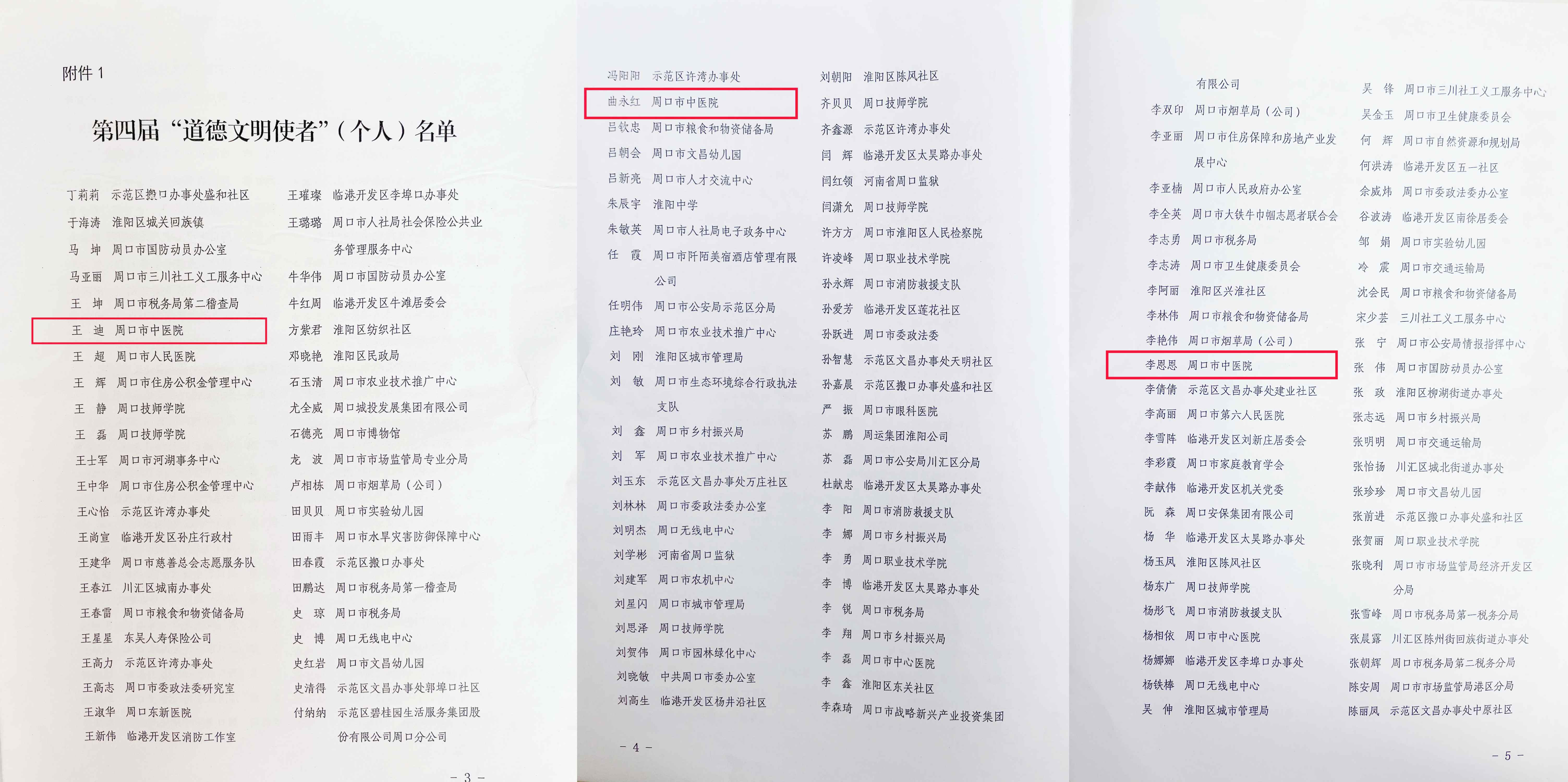 為大力培育和踐行社會主義核心價值觀,促進全市公民道德素質和社會文明程度進一步提升,助力全國文明城市創建,市文明委開展了第四屆“道德文明使者”評選活動。按照“道德文明使者”的評選標準,經活動組委會評選審定,周口市中醫院曲永紅、李恩恩、王迪榮獲周口市第四屆“道德文明使者”(個人)稱號。