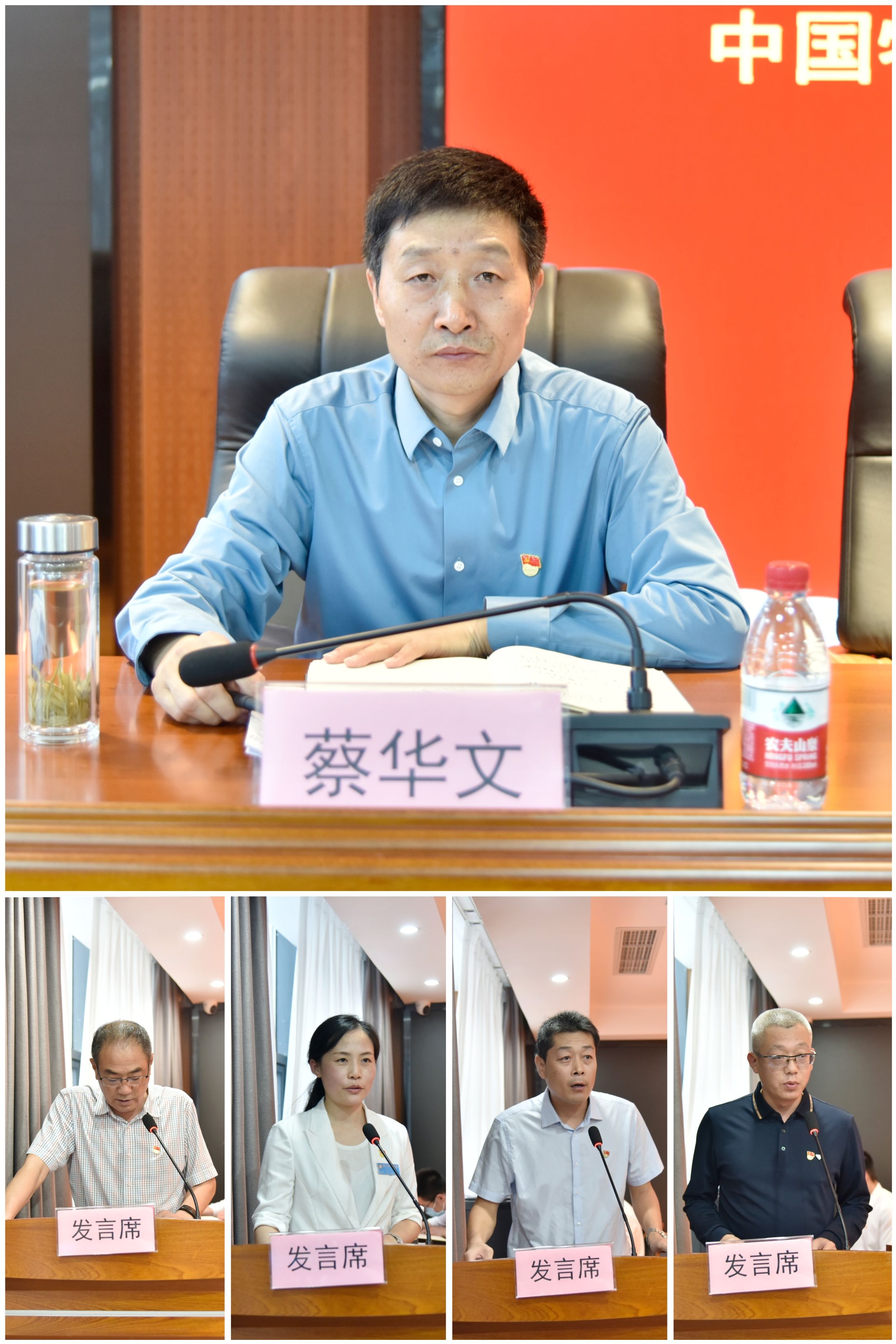 紀委書記蔡華文、制劑黨支部書記郭國富、門診第一黨支部書記康娜、內科第三黨支部書記王俊峰、外科第二黨支部書記張軍偉結合學習體會進行交流發言。