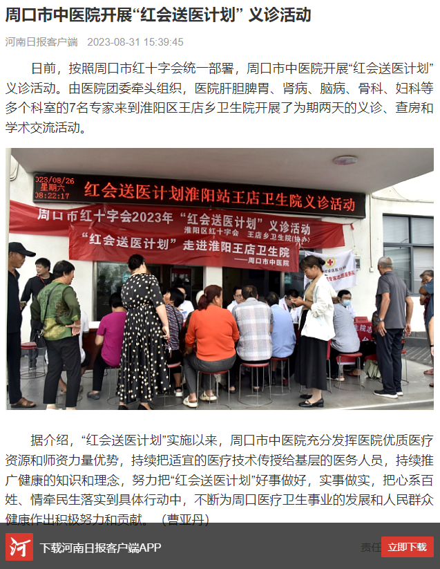 據介紹,“紅會送醫計劃”實施以來,周口市中醫院充分發揮醫院優質醫療資源和師資力量優勢,持續把適宜的醫療技術傳授給基層的醫務人員,持續推廣健康的知識和理念,努力把“紅會送醫計劃”好事做好,實事做實,把心系百姓、情牽民生落實到具體行動中,不斷為周口醫療衛生事業的發展和人民群眾健康作出積極努力和貢獻。(曹亞丹)