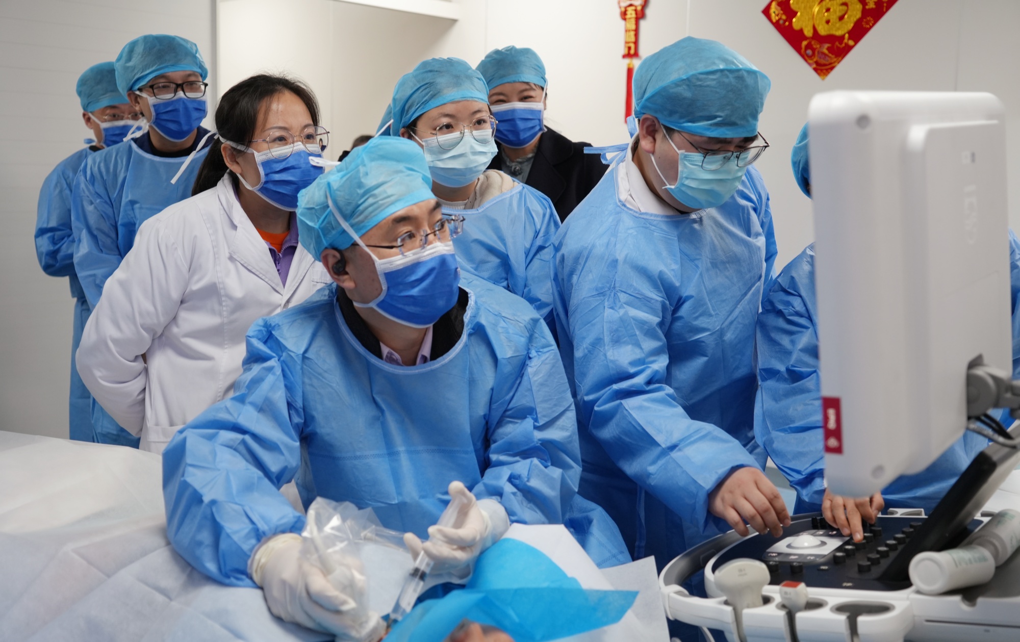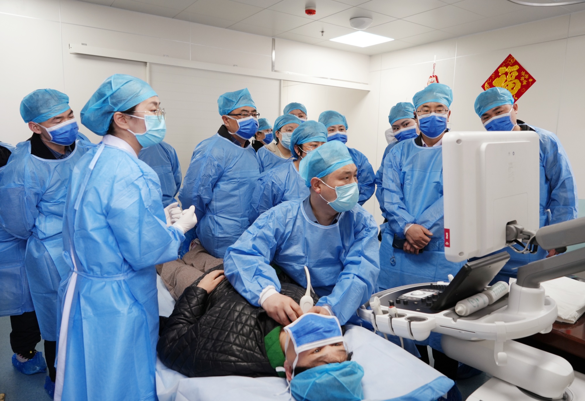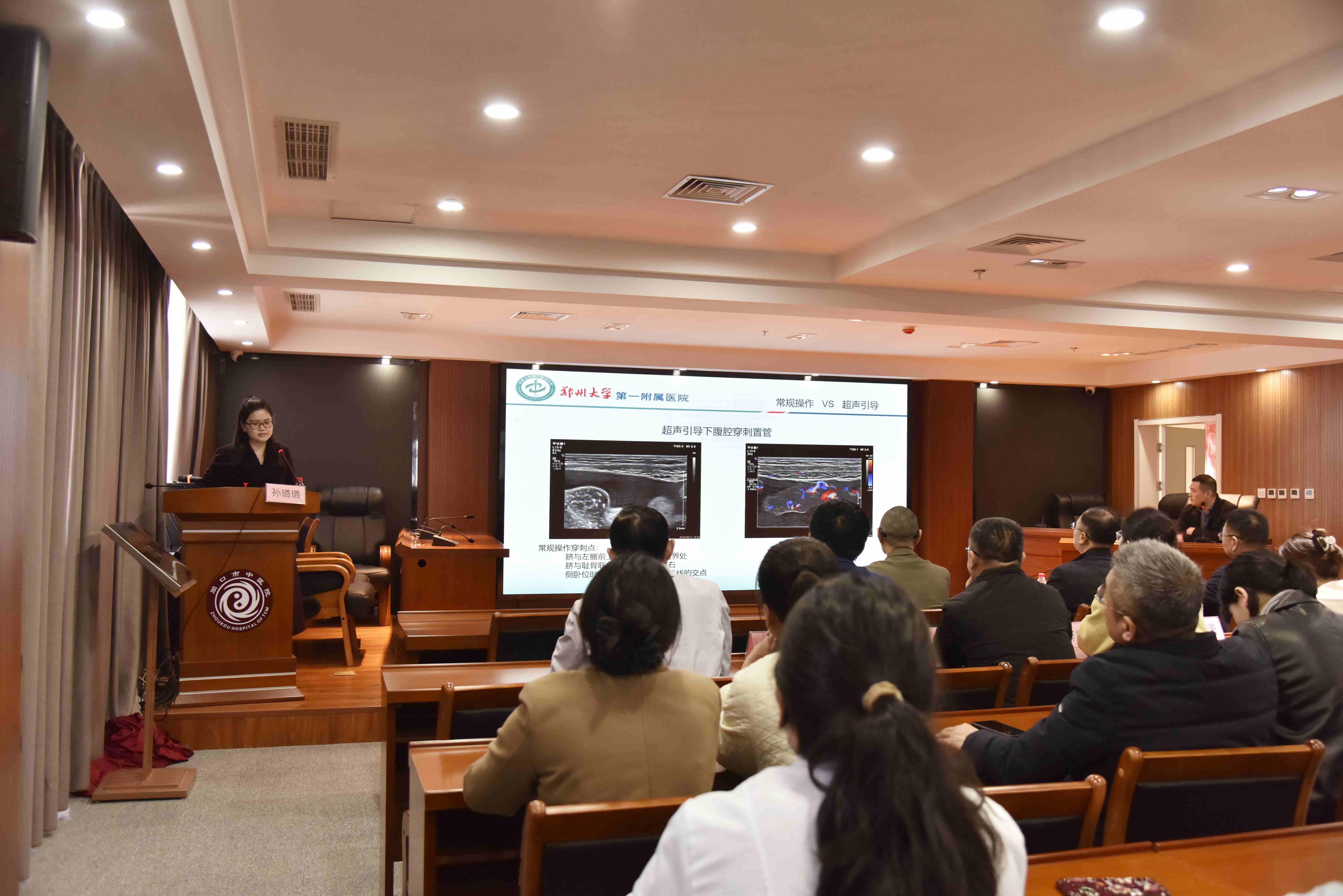 隨后,鄭州大學第一附屬醫院超聲科副主任介入病區負責人董剛教授、周口市中醫院超聲介入科負責人朱增良在5號樓2樓開展手術演示。來自各市縣區的超聲介入同仁進行觀摩學習。