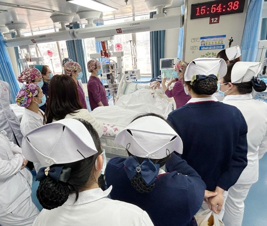 責護組長張小蕾、劉寧寧一對一現(xiàn)場演示重癥患者床旁交接