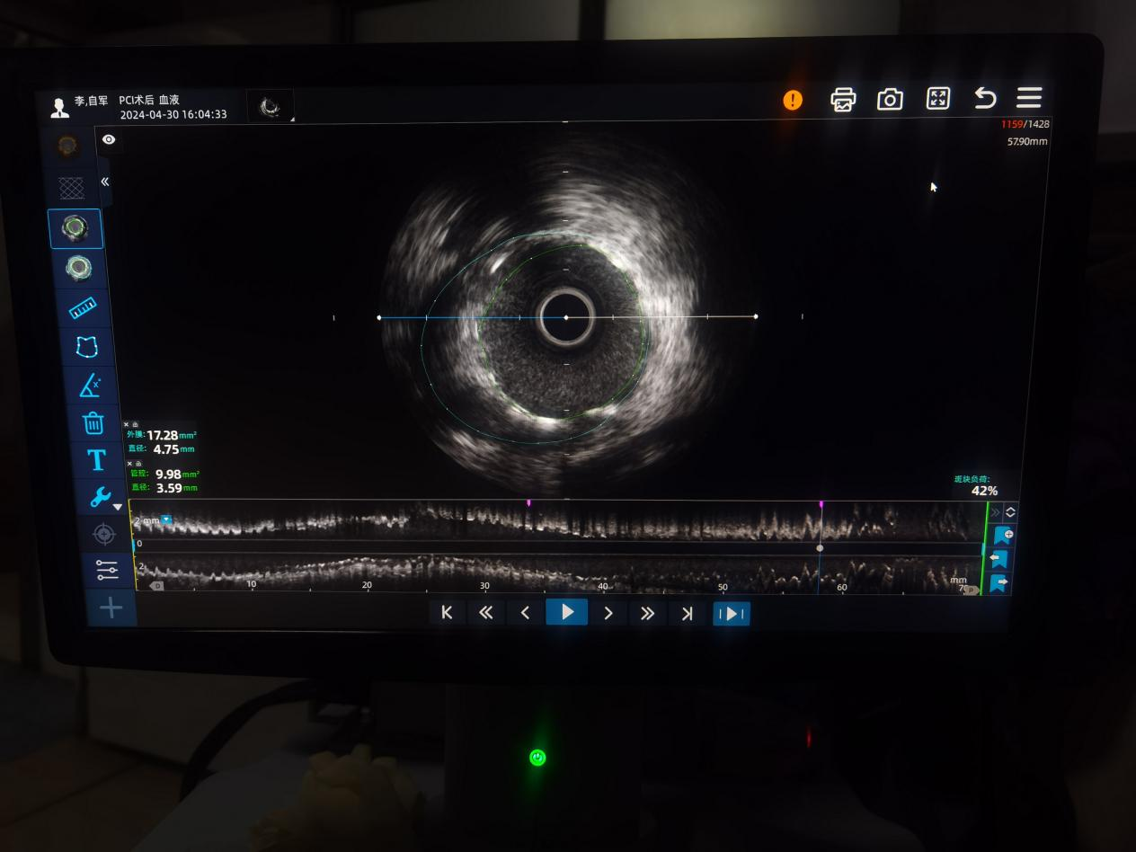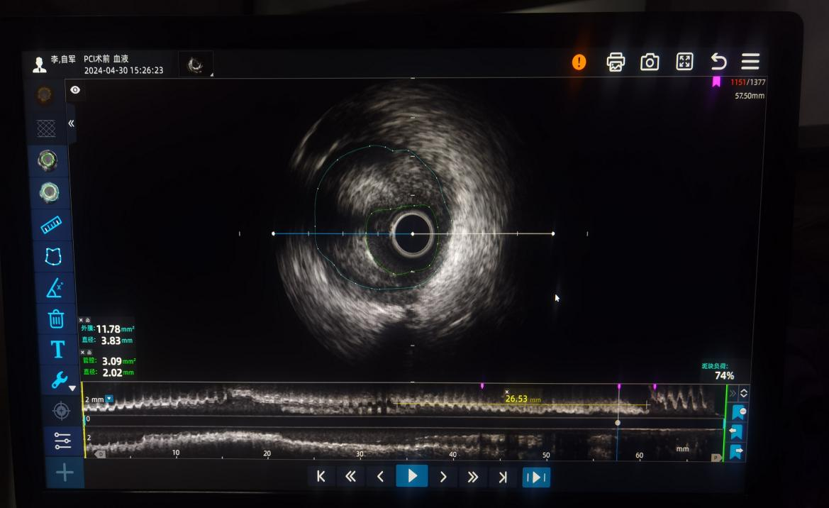為精準實施治療,心病一病區介入團隊決定在血管內超聲(IVUS)引導下為患者行冠狀動脈介入術。經團隊密切配合,結合冠脈造影,順利完成血管內超聲(IVUS)檢查,發現患者病變血管最小直徑僅2.02mm,管腔面積3.09mm2,斑塊負荷達到74%。