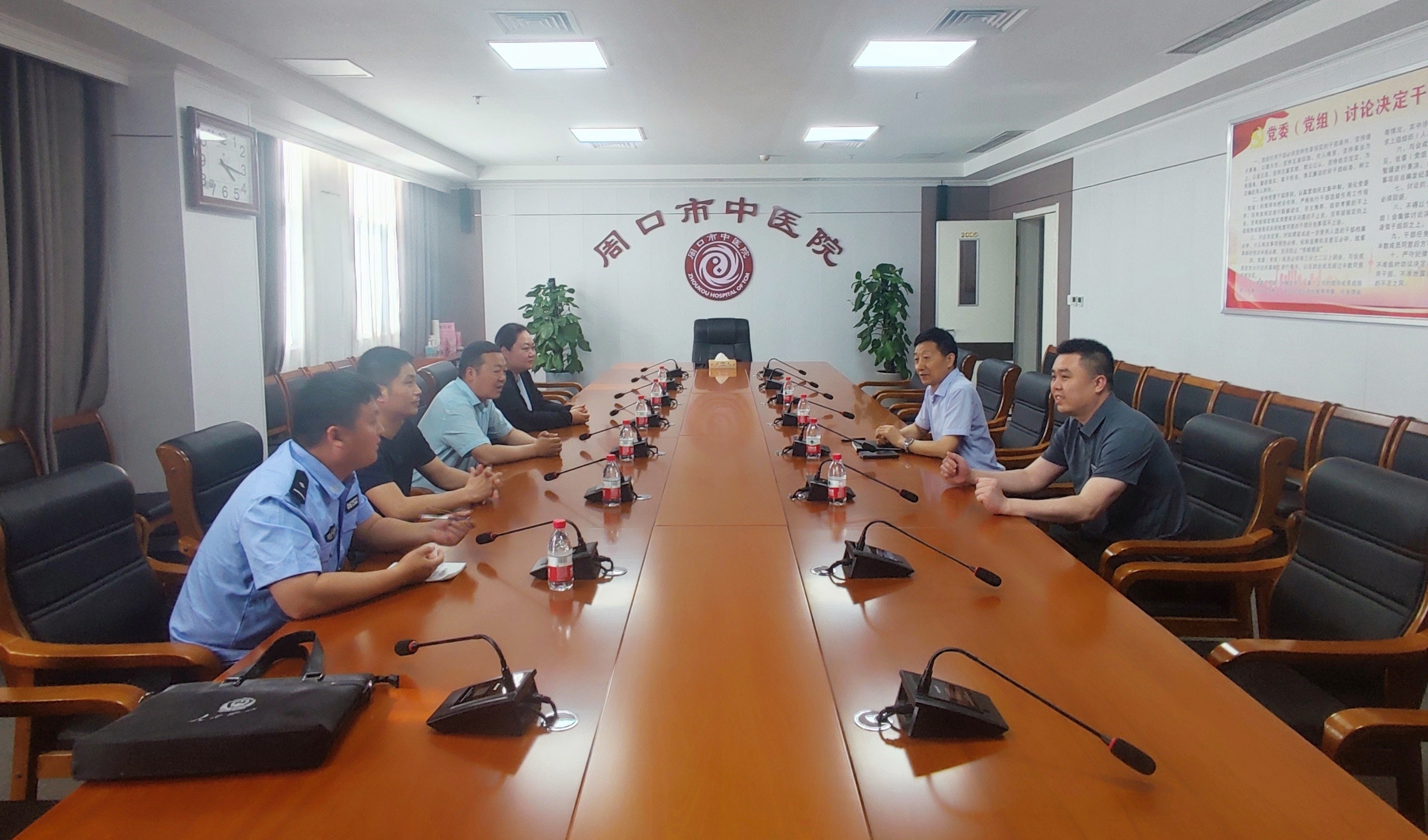 5月16日,周口市公安局反恐支隊政委王付威一行4人蒞臨周口市中醫院檢查指導反恐防暴工作,周口市中醫院紀委書記蔡華文、保衛科科長李偉陪同檢查。
