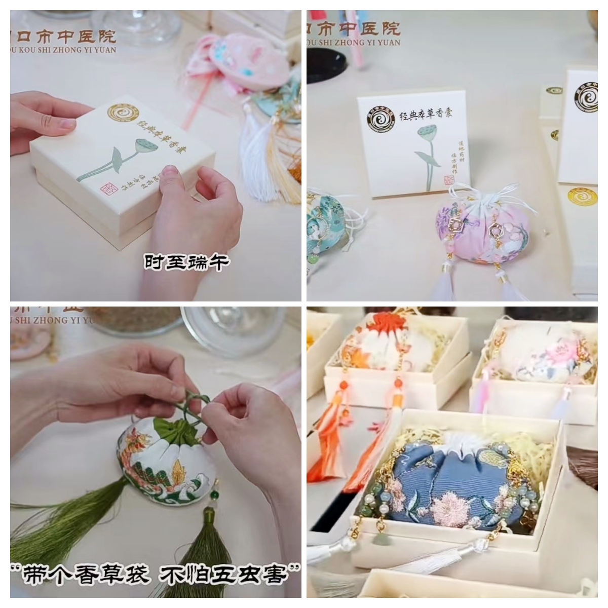 中藥香囊佩戴追溯與《山海經(jīng)》:“有草焉,名曰熏草,麻葉而方莖,赤華而黑實(shí),臭如蘼蕪,佩之可以已癘”、“有木焉,其狀如榖而黑理,其華四照。其名曰迷榖,佩之不迷”。《離騷》中有“扈江離與辟芷兮,紉秋蘭以為佩”。