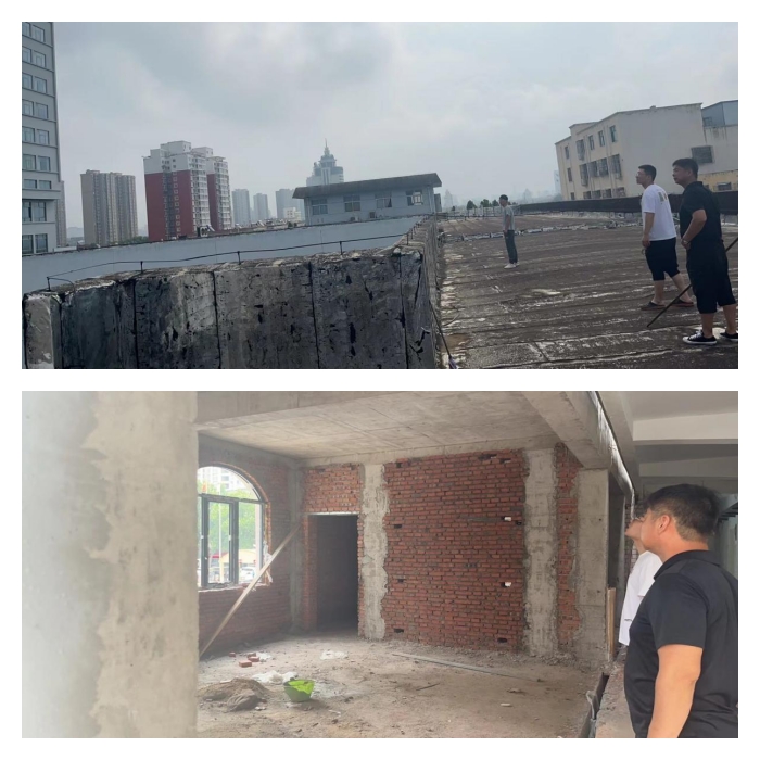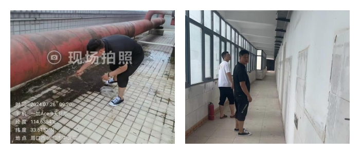 檢查組一行人對1號樓、2號樓高空廣告牌、天臺等進行細致排查,排查中對樓頂排水口垃圾進行了及時清理,隨后,檢查了3號樓在建工地懸掛物、材料堆放處等風險隱患點,并就存在的問題進行現場整改,確保臺風來臨時有備無患。
