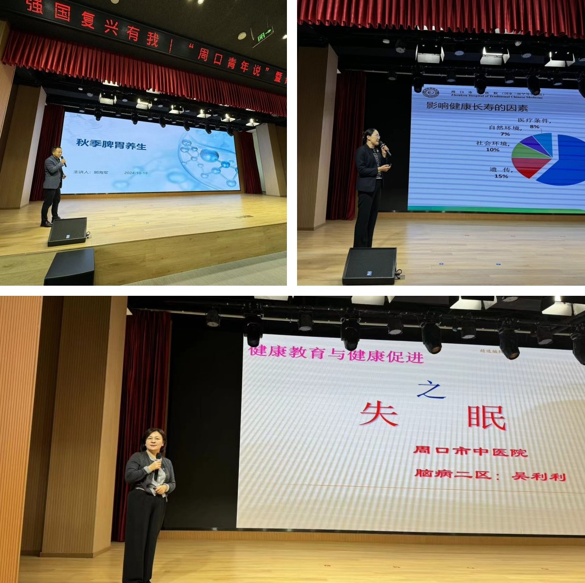 10月19日上午,由共青團(tuán)周口市委、周口市青年聯(lián)合會(huì)主辦的周口市“周口青年說”暨青年中醫(yī)大講堂第一期活動(dòng)開課啦。周口市中醫(yī)院由團(tuán)委牽頭,選派肺病專家袁少先、肝膽脾胃病二病區(qū)主任郭海軍、營養(yǎng)科主任韓玉榮、腦病二病區(qū)副主任吳利利等一行10人走進(jìn)周口市青少年活動(dòng)中心,為大家進(jìn)行中醫(yī)科普知識(shí)講座,并免費(fèi)為大家提供中醫(yī)養(yǎng)生項(xiàng)目體驗(yàn)。