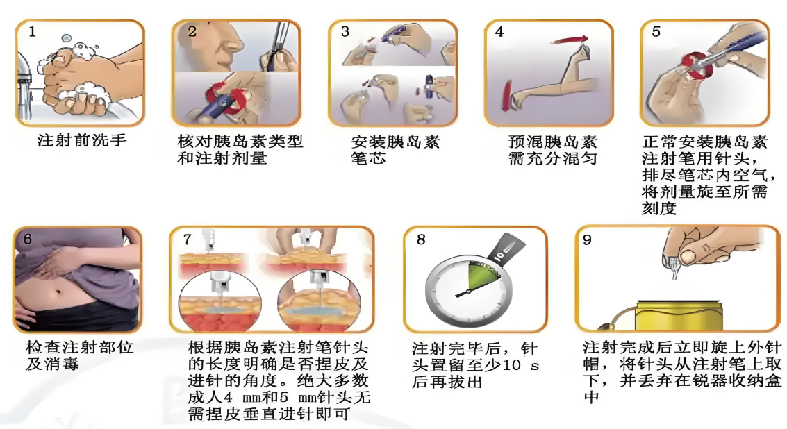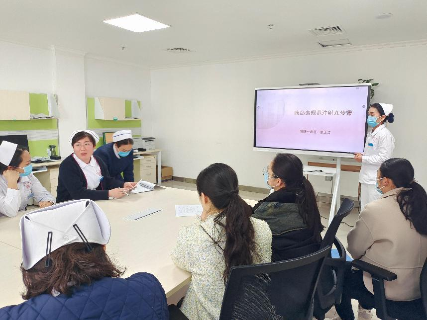 腎病糖尿病一病區主管護師康玉潔帶領大家共同學習了《中國2型糖尿病運動治療指南(2024版)》,此指南為2型糖尿病患者提供了科學、系統的運動干預方案,強調了個體化、安全性和可操作性。通過合理的運動處方,患者可以有效改善血糖控制、減少并發癥風險。同時,學習了胰島素規范注射的9步驟(洗手-核對-安裝-搖勻-排氣-消毒-注射-停留-處置),幫助患者提高胰島素的吸收效率,助力血糖達標。