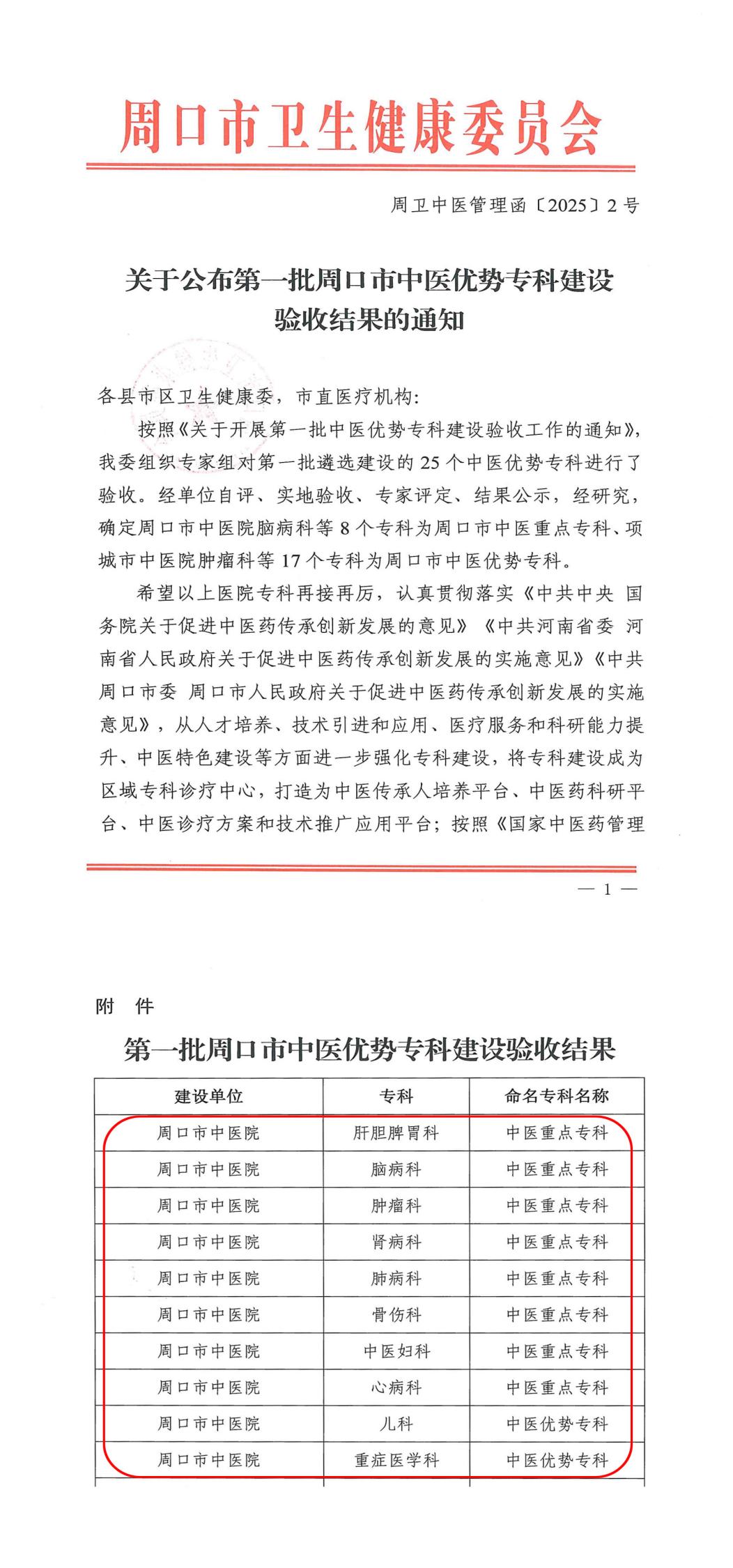 近日,市衛生健康委發文公布了第一批周口市中醫優勢??平ㄔO驗收結果,經單位自評、市衛健委組織臨床專家實地驗收和評定、結果公示等環節,我院肝膽脾胃科、腦病科、腫瘤科、腎病科、肺病科、骨傷科、中醫婦科、心病科被評定為中醫重點???/strong>,兒科、重癥醫學科被評定為中醫優勢???/strong>。