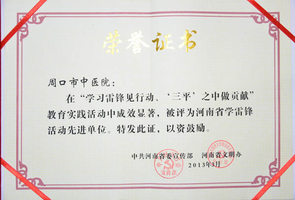周口市中醫院榮獲“河南省學雷鋒活動先進單位”