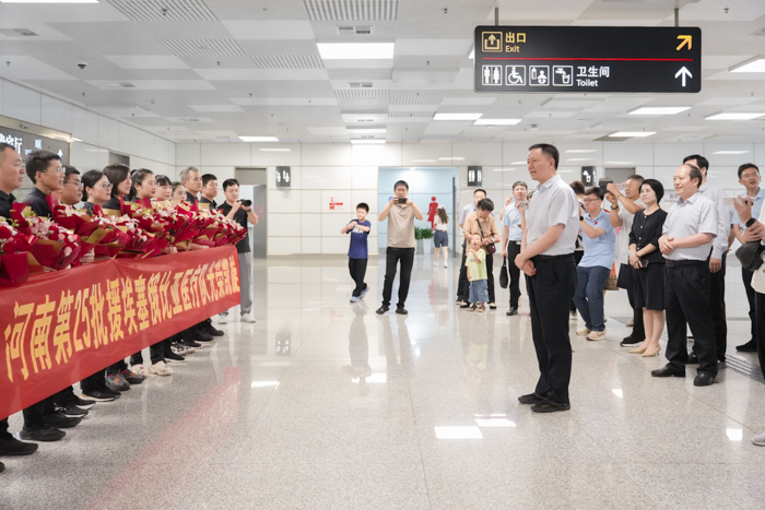 2025 年 7 月5 日,由周口市衛健委選派的中國第 25 批援埃塞俄比亞醫療隊,圓滿完成為期13 個月的醫療援助任務,平安踏上祖國的土地。河南省衛生健康委合作交流處處長孔芳,副處長宋娟、蘇桂顯,周口市衛生健康委主任胡國勝,副主任李波,周口市中醫院黨委書記史衛東及醫院領導班子成員,帶領醫院相關部門人員,還有醫療隊隊員家屬,齊聚新鄭國際機場,翹首以盼,迎接英雄們凱旋。
