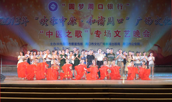 為豐富全市人民的文化生活,滿(mǎn)足廣大市民的精神文化需求,2013年8月27日晚,由中共周口市委宣傳部、周口市文化廣電新聞出版局、周口市公安局主辦,周口市中醫(yī)院承辦的“歡樂(lè)中原﹒和諧周口”廣場(chǎng)文化活動(dòng)——“中醫(yī)之歌”專(zhuān)場(chǎng)文藝晚會(huì)在周口市五一廣場(chǎng)舉行。