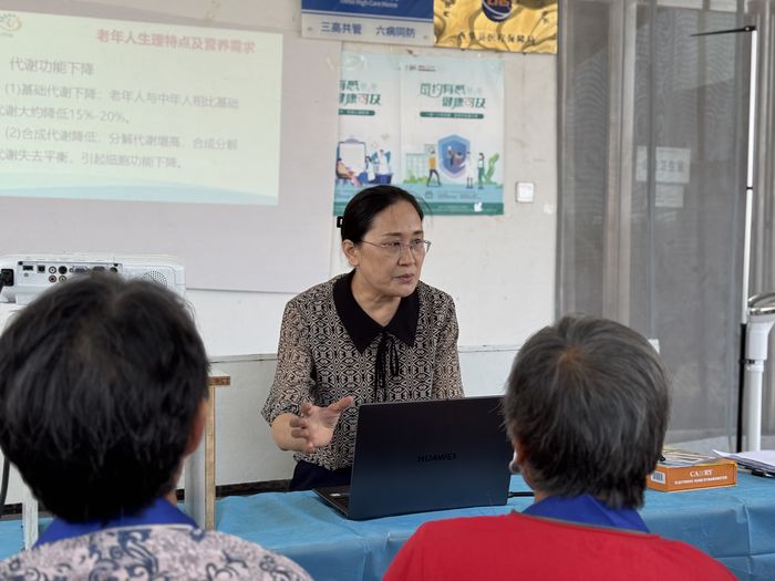 活動開始,營養科主任韓玉榮帶著精心準備的PPT,用通俗易懂的語言為老人們講解《中國老年人膳食指南》核心內容,從“食物多樣、合理搭配”到“足量飲水、適量運動”,并針對老年“肌少癥”給大家進行細致解讀,從啥叫肌少癥、肌少癥的危害、肌少癥常見癥狀及如何通過飲食與運動改善肌少癥帶來的不適癥狀,結合當地飲食習慣舉例說明,提醒大家少吃高鹽、高糖、高油食物,適當增加優質蛋白和膳食纖維攝入,讓在場老人聽得明明白白。