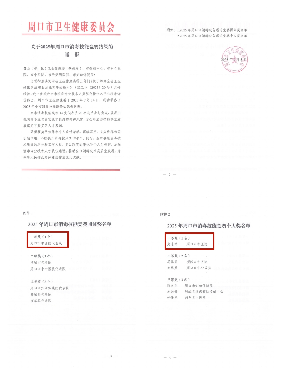 2025年7月14日,由周口市衛健委主辦、市疾控中心(衛生監督所)承辦的全市消毒和職業健康技能競賽圓滿落幕。我院檢驗科趙東林、陳力豪兩位同志組成的代表隊榮獲團體一等獎!同時,趙東林同志以優異的成績斬獲個人一等獎!