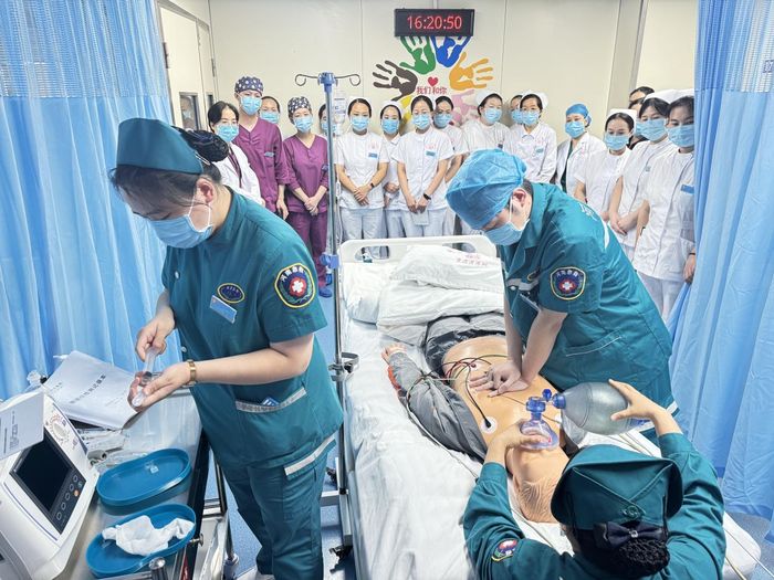 理論講解后,急診病區李雪茹、史蒙蒙、王文豪3名護士組成演示團隊,借助模擬人開展實戰化急救演示。演示場景緊密貼合臨床實際:發現“患者”猝死后,立即評估環境安全、判斷生命體征,同步呼叫救援團隊;一人迅速實施胸外按壓,動作標準有力且保持節奏連貫,確保胸廓充分回彈;一人清理氣道異物,采用仰頭提頦法開放氣道并配合人工呼吸;另一人快速準備AED設備,規范粘貼電極片并模擬除顫操作,整個過程分工明確、銜接流暢,完整呈現了“判斷—呼救—按壓—通氣—除顫”的黃金搶救鏈條。