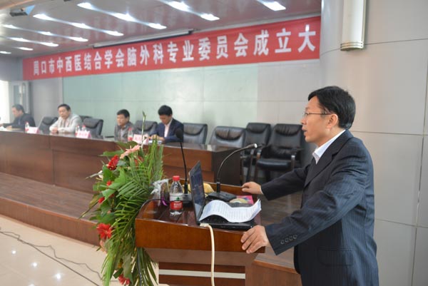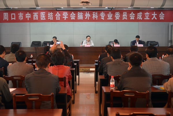 2013年10月19日,周口市中西醫結合學會腦外科專業委員會成立大會在我院召開。河南省放射學會委員、介入放射學組副組長、省抗癌協會理事、腫瘤介入專業委員會副主任委員、鄭大二附院介入科主任、研究生導師馮廣森教授, 鄭大五附院神經外科主任、研究生導師壽記新教授,周口市中醫管理辦公室副主任蔣文,我院副院長史衛東等出席了會議。
