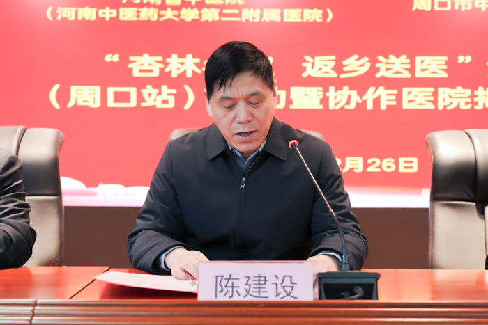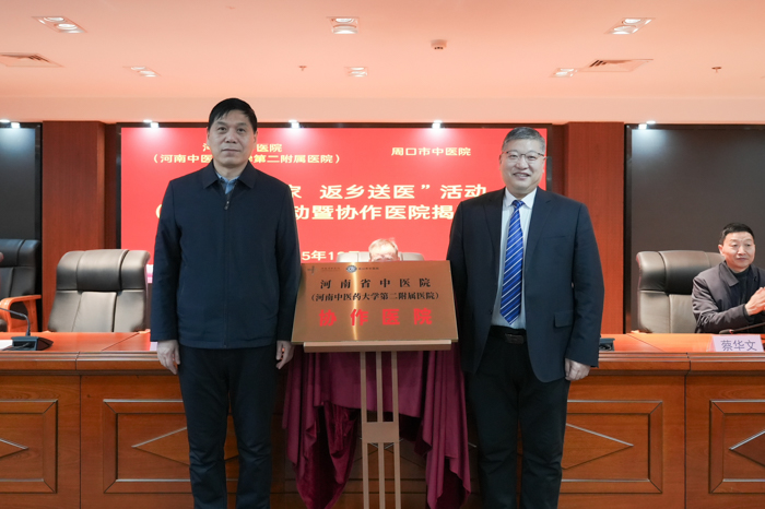 12月26日上午,“杏林名家 返鄉送醫”活動周口站啟動暨協作醫院、全國名老中醫藥專家傳承工作室揭牌儀式在周口市中醫院5號樓20樓隆重舉行。河南省中醫院副院長陳建設,全國優秀中醫臨床人才、全國名老中醫鄧素玲,河南省中醫院對外合作辦公室主任梁慕華,周口市衛健委二級調研員王玉棟,周口市中醫院黨委副書記、院長毛國璋,工會主席張紅梅,紀委書記蔡華文,以及杏林返鄉專家、醫院職工代表齊聚現場,共同見證這一助力基層中醫藥發展、惠及周口百姓的重要時刻。儀式由周口市中醫院工會主席張紅梅主持。
