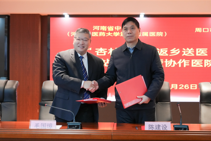 河南省中醫院副院長陳建設與周口市中醫院院長毛國璋共同簽署“醫聯體協作單位”協議、補充協議及“高水平專科”協議