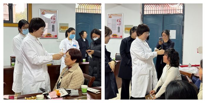活動(dòng)現(xiàn)場(chǎng)暖意融融,針灸科團(tuán)隊(duì)帶來(lái)多項(xiàng)特色中醫(yī)服務(wù),精準(zhǔn)對(duì)接職場(chǎng)女性健康需求。針灸科負(fù)責(zé)人吳志敏詳細(xì)講解面部美容針,通過(guò)刺激迎香、四白、地倉(cāng)等穴位,促進(jìn)循環(huán)、緊致肌膚、調(diào)理臟腑,讓在場(chǎng)女士直觀感受中醫(yī)抗衰的獨(dú)特魅力;針對(duì)頸肩腰腿痛、腰椎不適等職場(chǎng)常見問(wèn)題,專家現(xiàn)場(chǎng)開展針刺與把脈,快速疏通經(jīng)絡(luò)、放松肌肉、緩解疲勞;同時(shí)通過(guò)望聞問(wèn)切為大家辨證把脈,辨識(shí)肝郁氣滯、氣血不足、濕氣重等體質(zhì)問(wèn)題,一對(duì)一給出食療建議與生活調(diào)理方案,把專業(yè)健康指導(dǎo)送到每個(gè)人身邊。