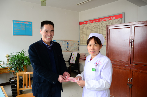 圖為我院婦產(chǎn)科護(hù)士王春麗將現(xiàn)金送還到失主手中