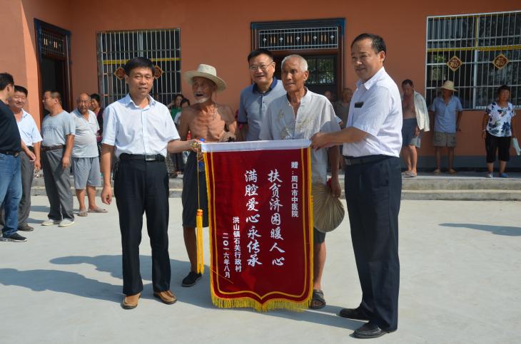 村民激動(dòng)說道,現(xiàn)在市里的名醫(yī)主動(dòng)來為我們上門義診,這是我們以前想都不敢想的事情,感謝周口市中醫(yī)院為我們村民帶來了關(guān)愛,我們深切的感受到了黨的溫暖”。村民送上內(nèi)容為“扶貧濟(jì)困暖人心,滿腔愛心永傳承”錦旗。