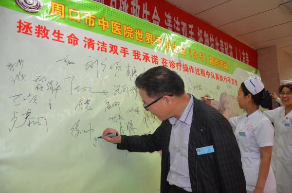 1、手衛生承諾簽名。在院黨委書記劉廣明、副院長魯恒心、史衛東和工會主席孫俊等領導的帶領下,全院所有科室主任、護士長及院感小組成員依次在我們的手衛生承諾墻上簽名,并承諾:在診療操作中認真執行手衛生。簽名結束后,院領導、科主任、護士長等帶領活動參與者進行七步洗手法的演示,大家興致高昂,全院共有500余人參與簽名活動。