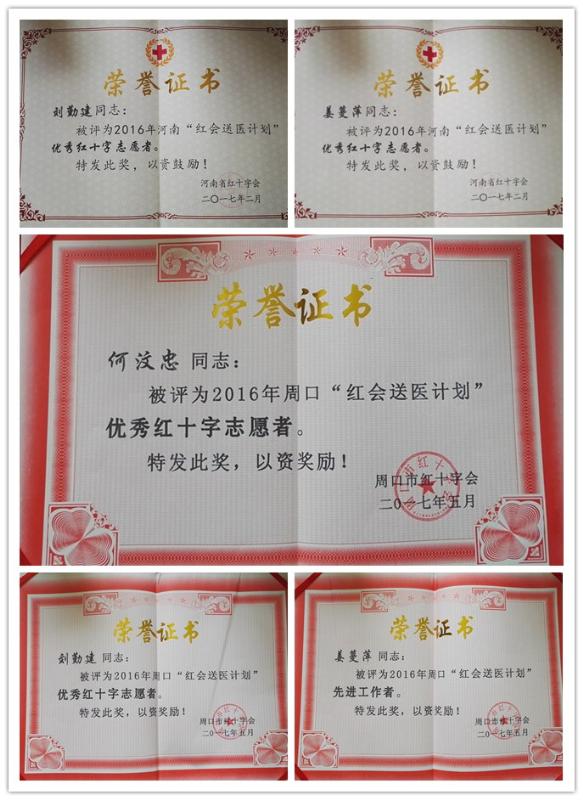5月24日在周口市委迎賓館召開了周口市2016年度先進紅十字志愿服務隊、先進工作者、優秀紅十字志愿者表彰會。我院喜獲得2016年周口“紅十字會送醫計劃”先進紅十字會先進服務隊稱號。姜蔓萍同志被授予周口市2016年度“紅會送醫計劃”先進工作者,劉勤建、何汶忠同志被授予周口市2016年度“紅會送醫計劃”優秀紅十字志愿者。姜蔓萍、劉勤建同志被授予河南省“紅會送醫計劃”優秀志愿者。目前我市有9個紅十字志愿服務隊,14名河南“紅會送醫計劃”先進工作者及11名“紅會送醫計劃”優秀紅十字志愿者獲此殊榮。